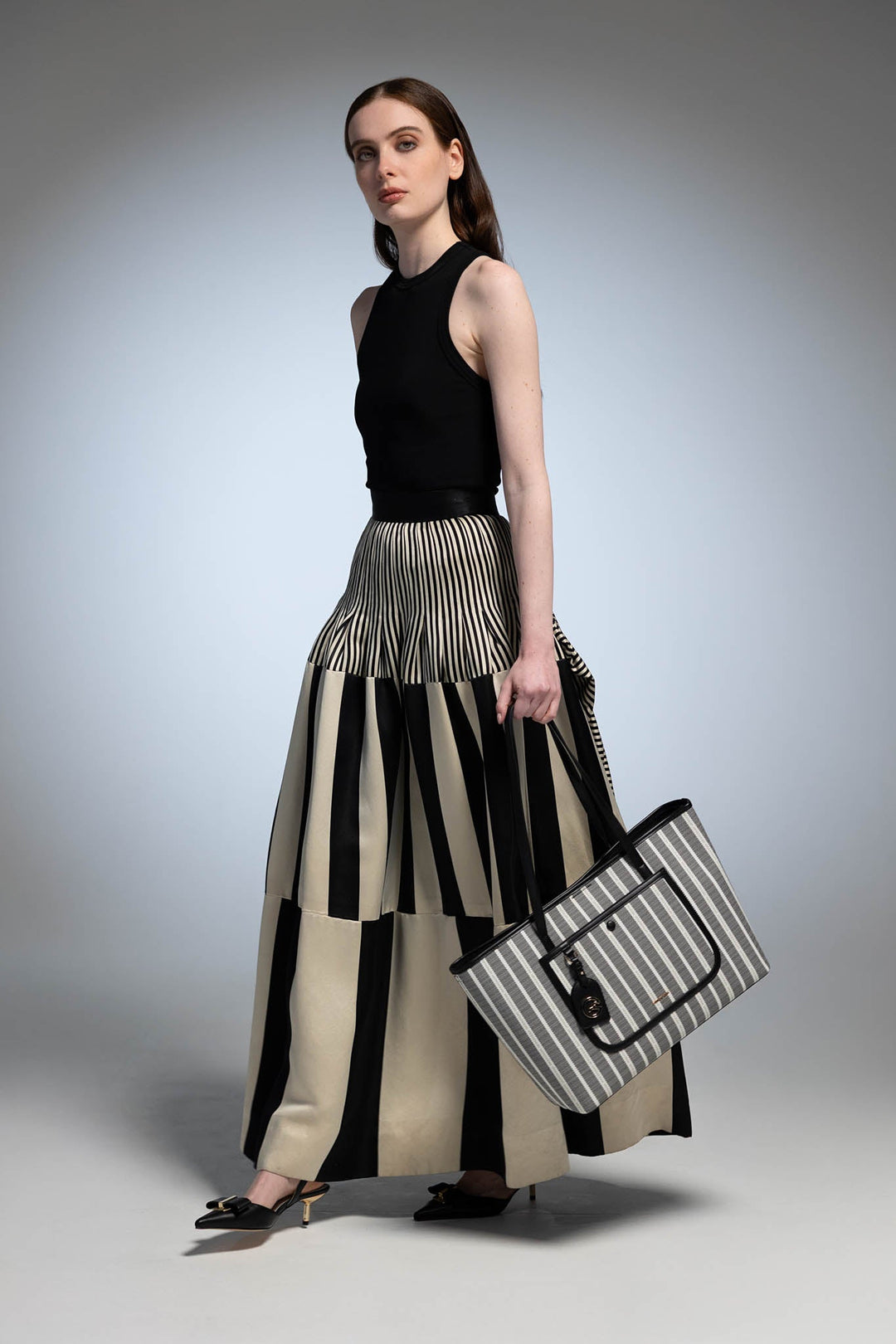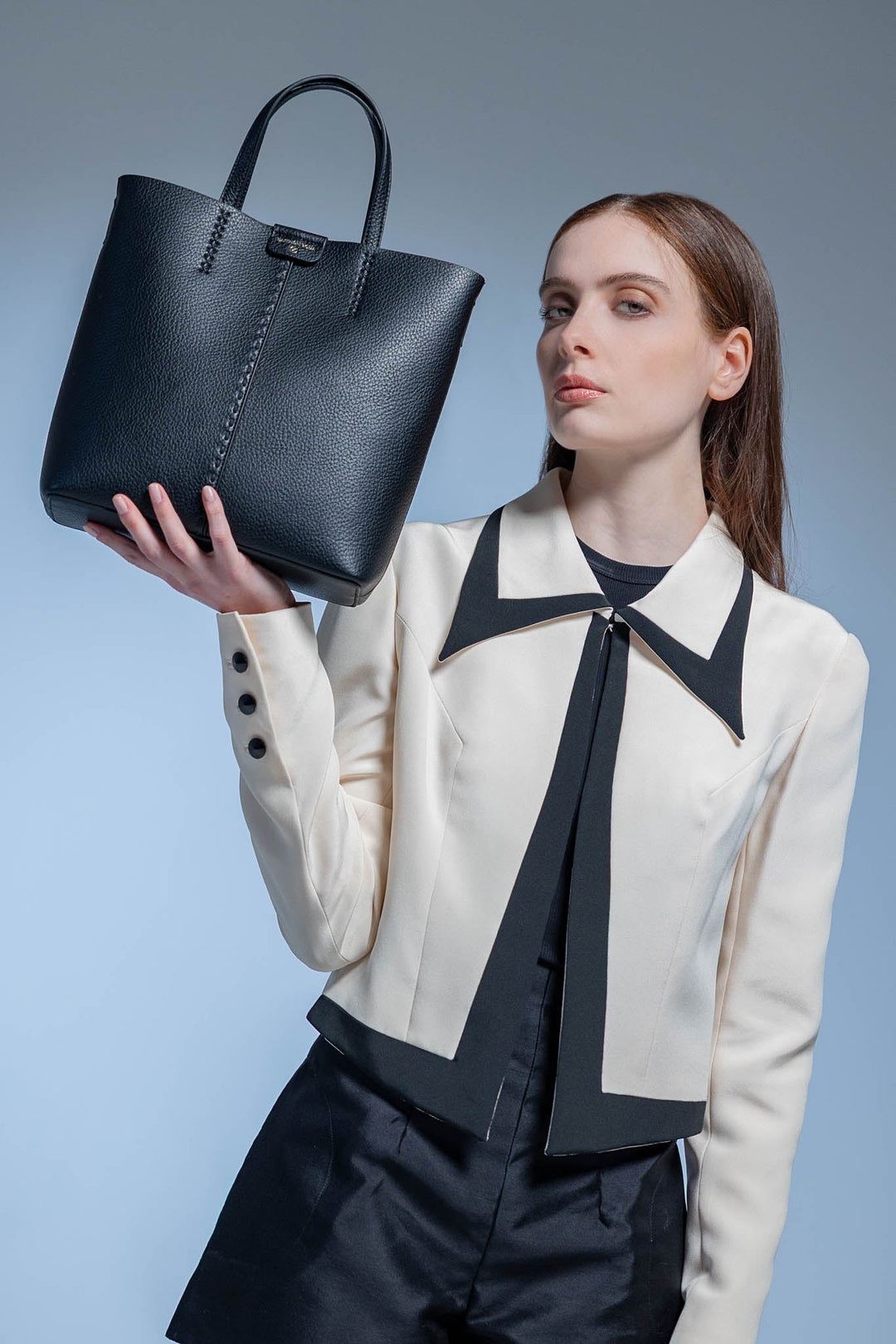 L'accostamento con la Flap Bag Delia SS25, espressione della linea Roma, non è fortuito: esso incarna la continuità di un'estetica sofisticata, un filo conduttore che unisce l'heritage Gattinoni con le esigenze del presente.
