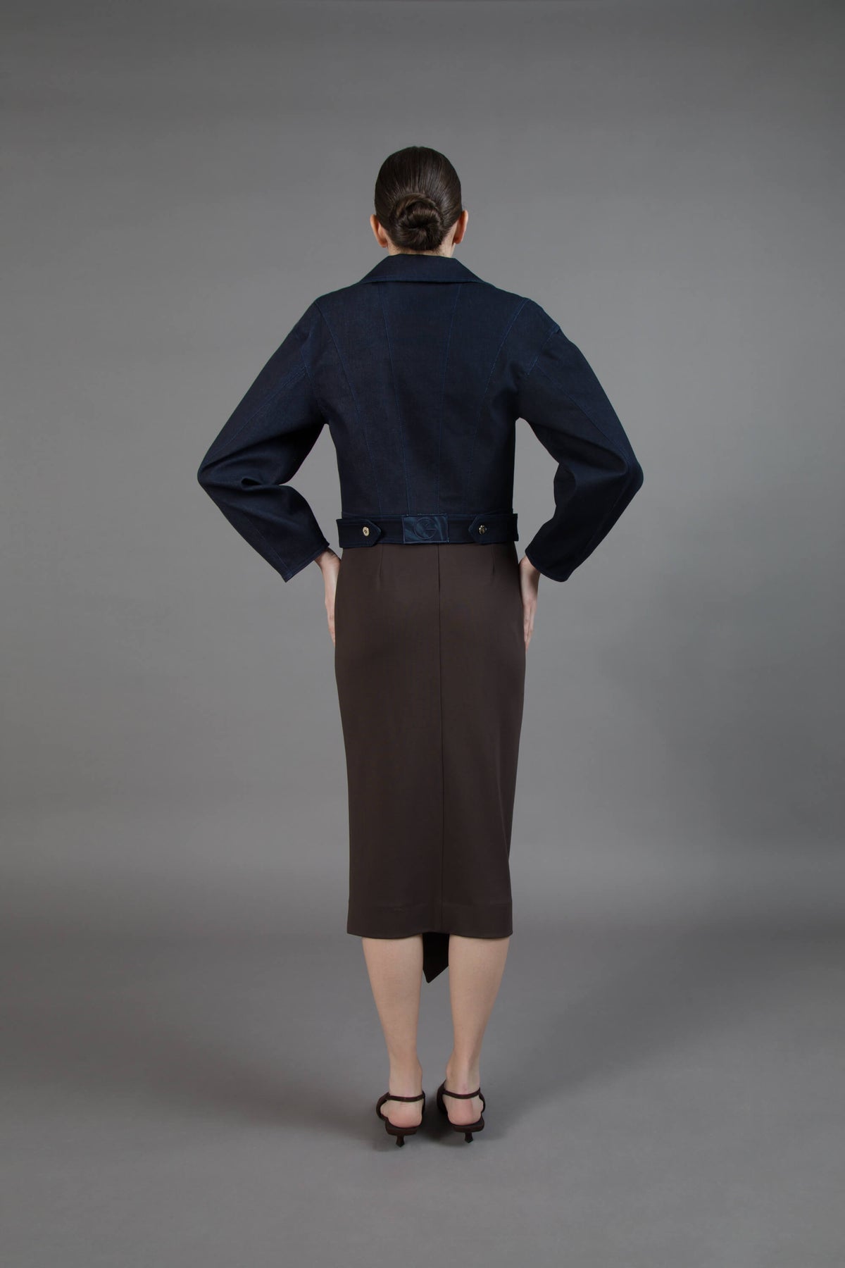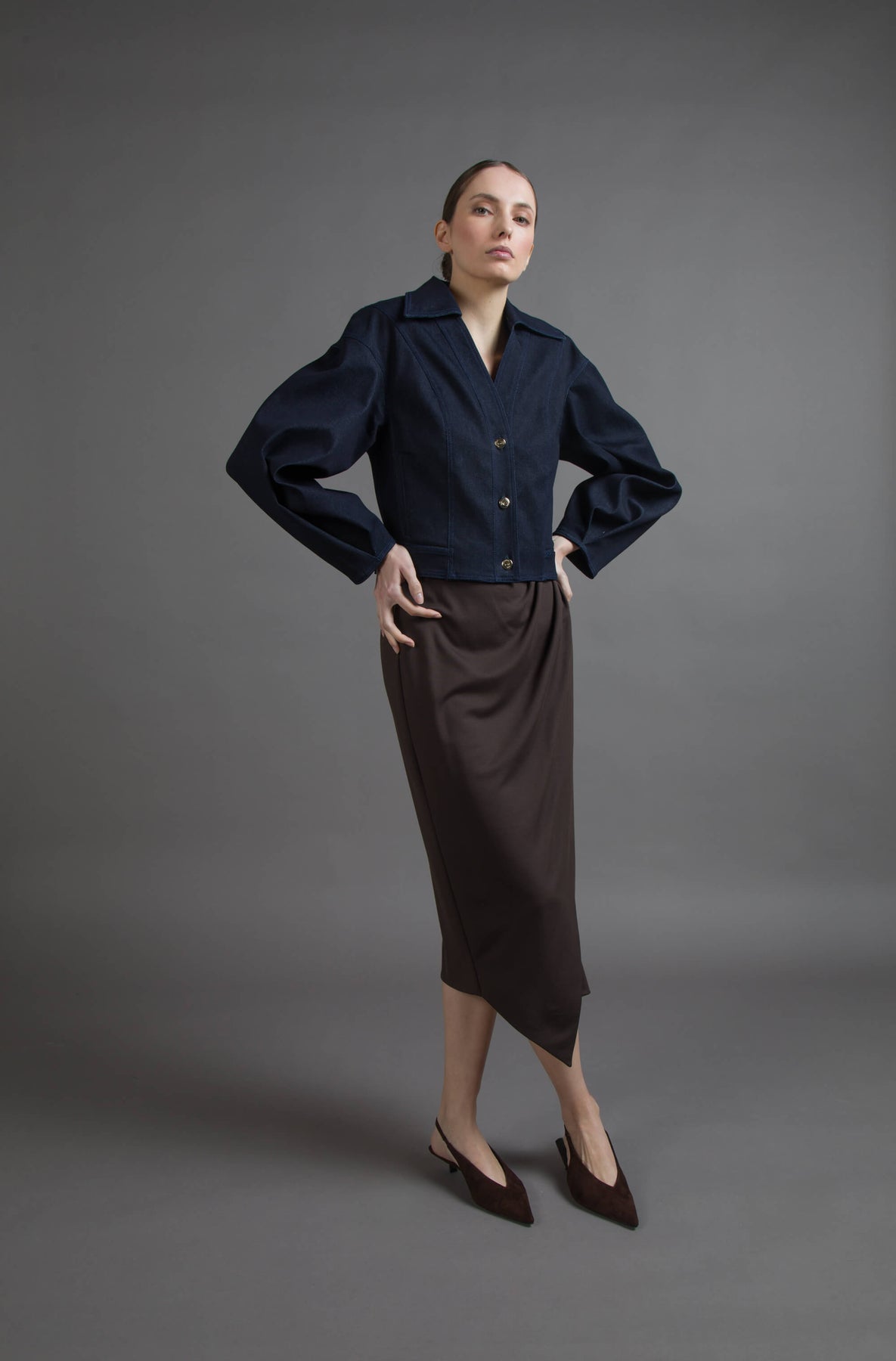 Denim scolpito, anima urbana. Le maniche ampie amplificano il gesto, gli intarsi raccontano un dialogo tra texture. I bottoni chiodo light gold sigillano un carattere deciso.