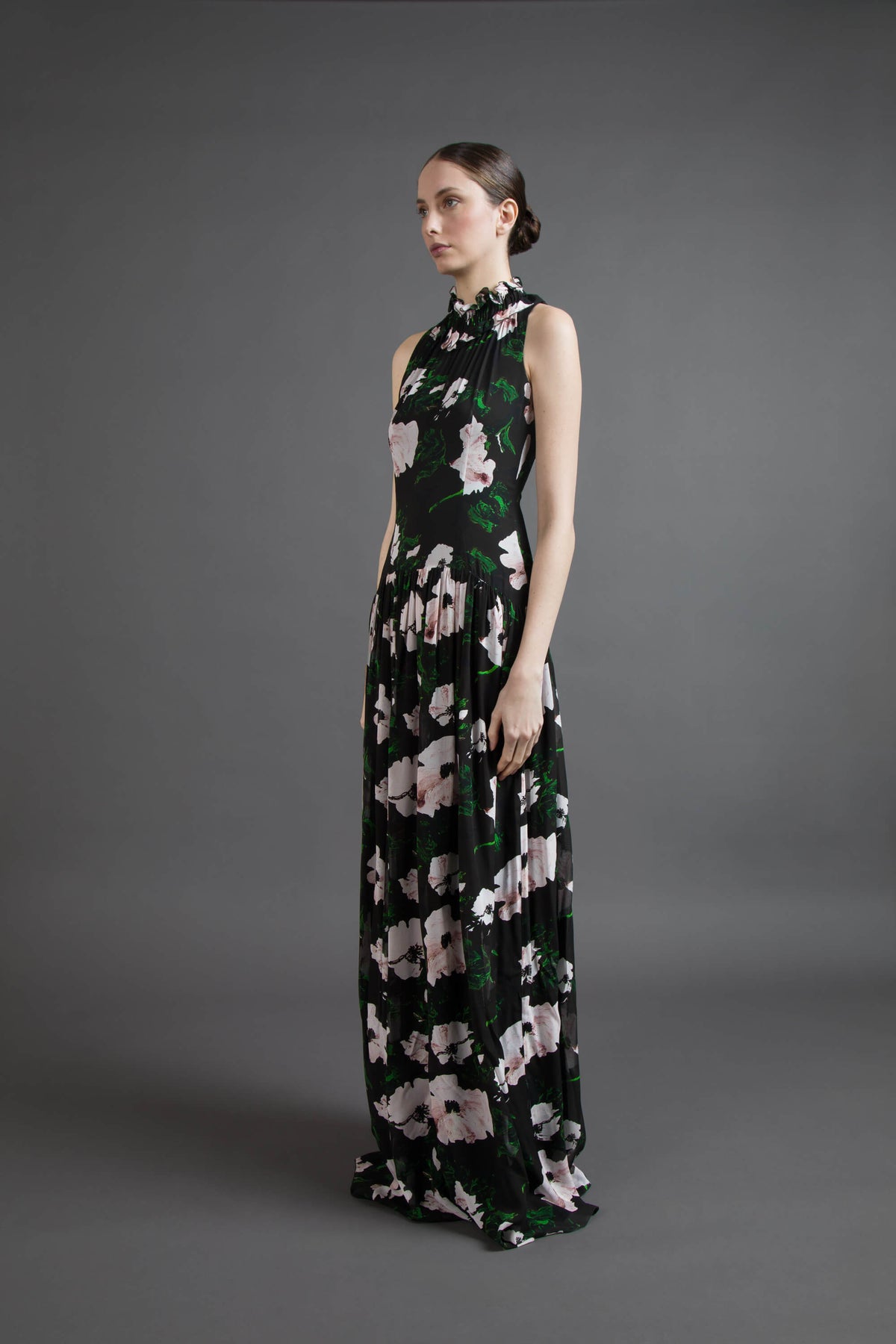 Leggero come un soffio. La georgette danza attorno al corpo, la stampa floreale vibra di romanticismo. Drappeggi e punto smock scolpiscono la figura con grazia naturale.