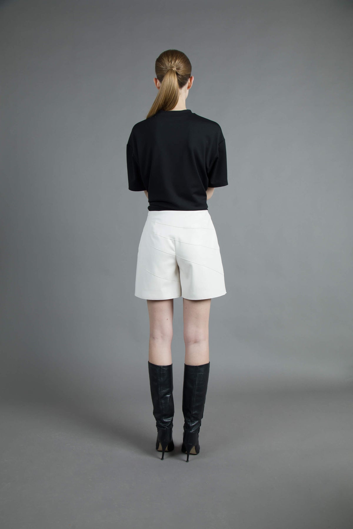 Essenziali e raffinati, questi shorts in ecopelle si distinguono per la linea pulita e la costruzione impeccabile. Perfetti in layering, si intravedono con discrezione creando un gioco di proporzioni moderno. La superficie compatta esalta la silhouette con eleganza contemporanea.