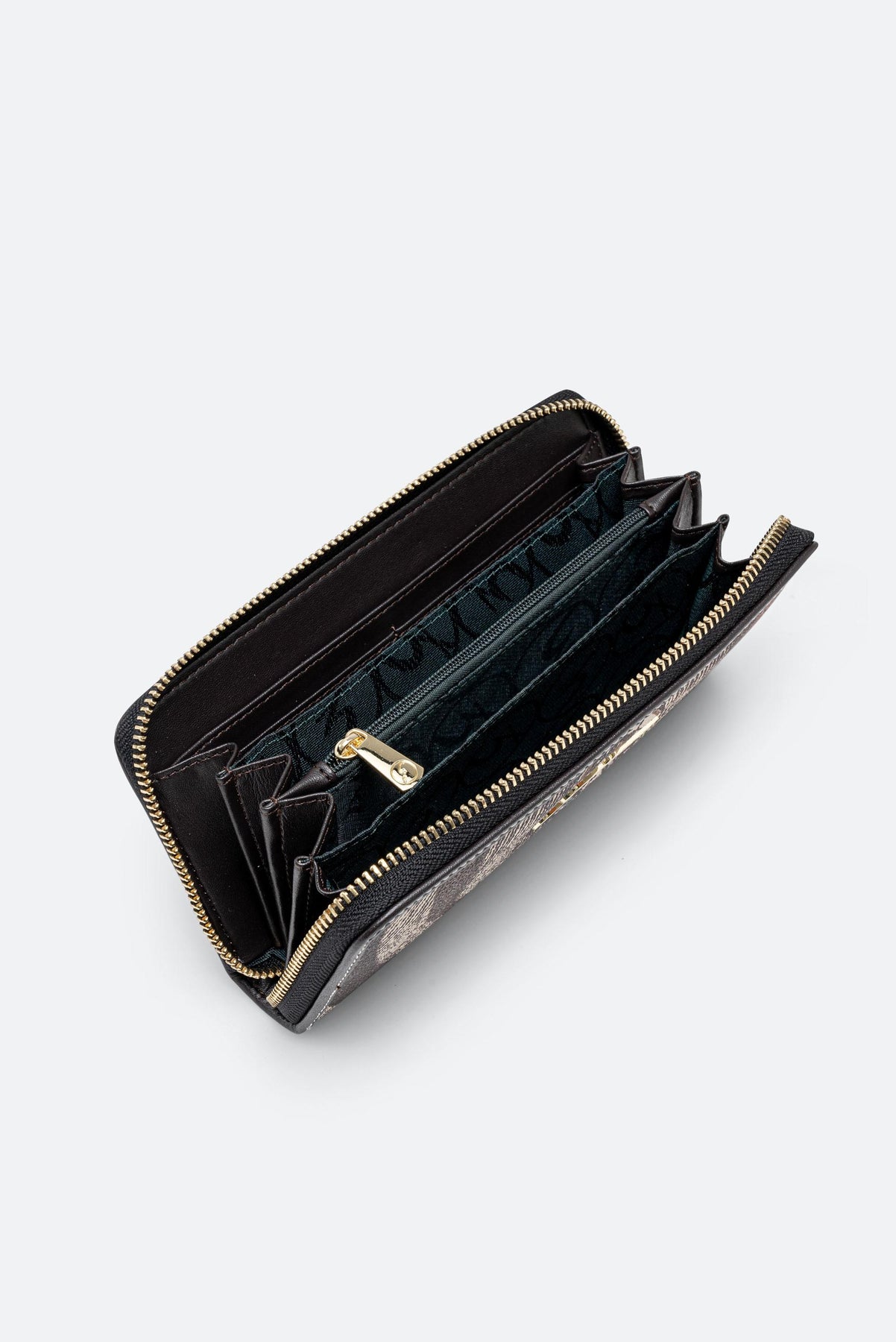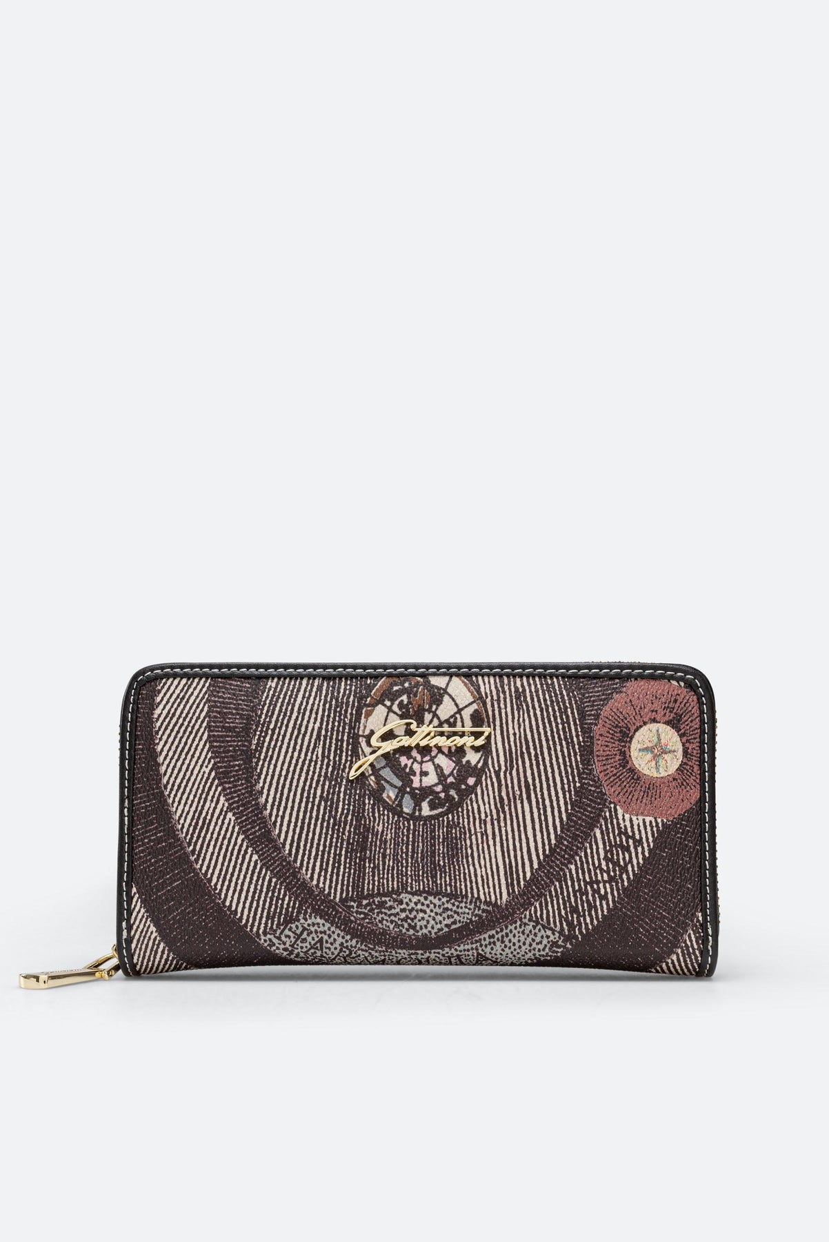 Pratico portafogli con l'iconica stampa Planetarium finiture marrone. Chiusura con zip e dotato di numerosi scomparti e tasche. Comodo e pratico, perfetto per l'uso giornaliero.