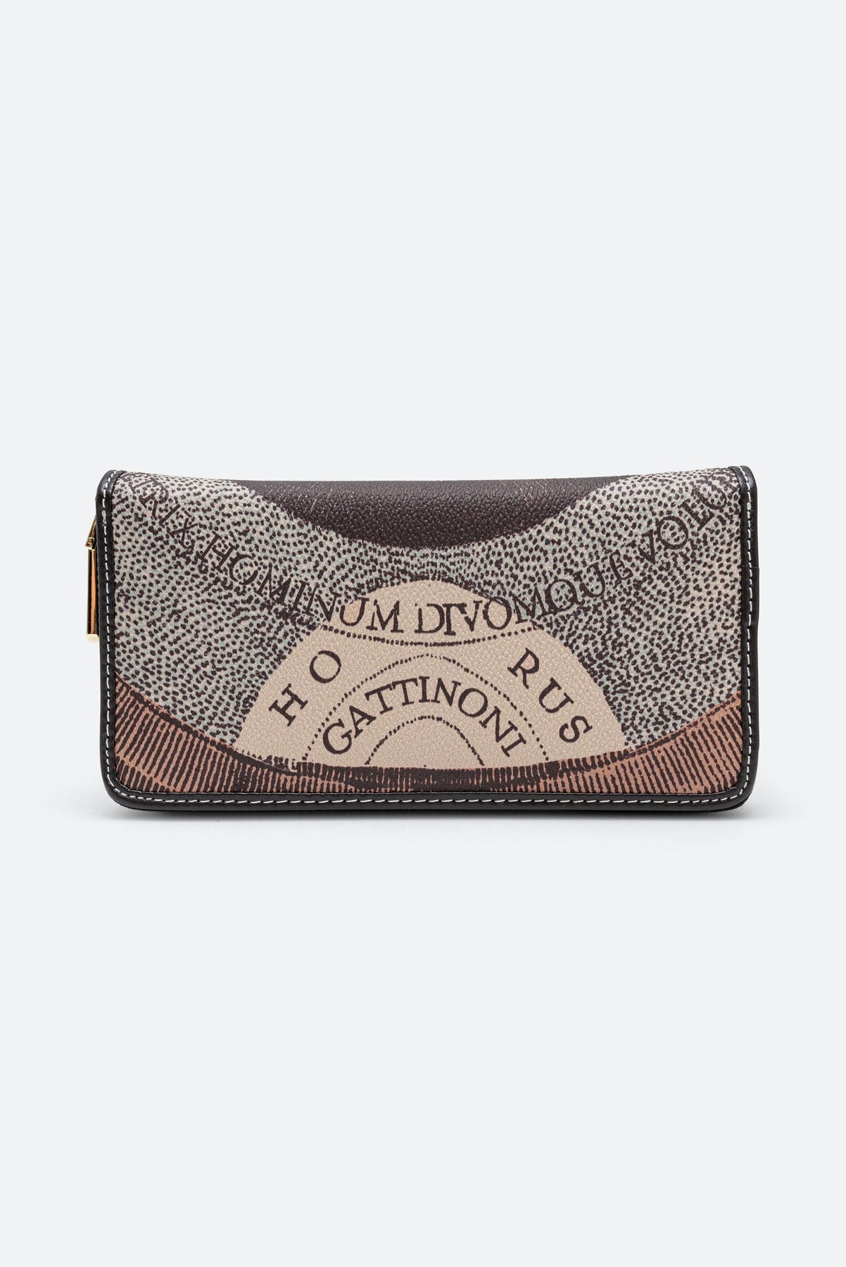 Materiale principale: 100% pelle sintetica. Materiale secondario: 100% pelle. Fodera: 100% poliestere. Dimensioni:19,5X10,5X3 CM. Chiusura con zip. Parti metalliche e loghi:METALLERIA ORO- TIRALAMPO METALLO LOGATO GATTINONI CORSIVO E G CERCHIATO. Tasche interne:3 COMPARTI BANCONOTE-1 TASCA ZIP - 2 TASCHE PIATTE- 12 PORTA CARTE DI CREDITO. Made in P.R.C..