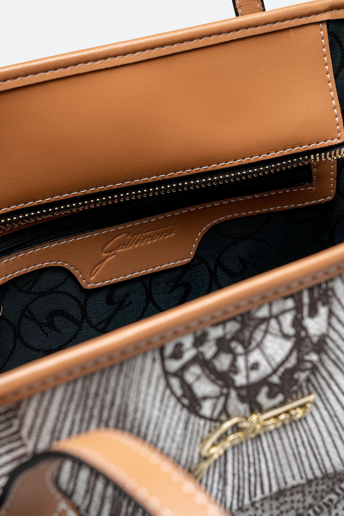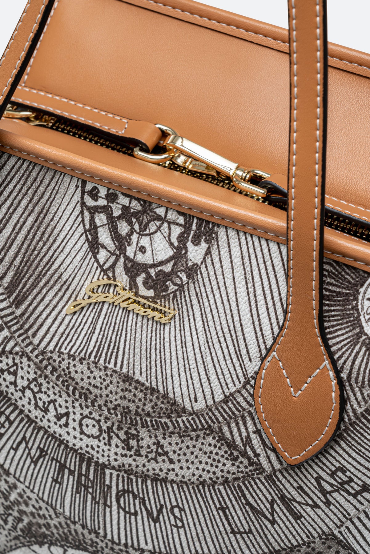 Shopping medium in tela spalmata Planetarium Watercolor, con dettagli in pelle. Chiusura con zip. All'interno dei 2 fianchi sono cuciti due cordoncini uno con anello e l'altro con moschettone in modo da potersi allacciare e stringere i lati della borsa verso l'interno per poterla chiudere in maniera più sicura.