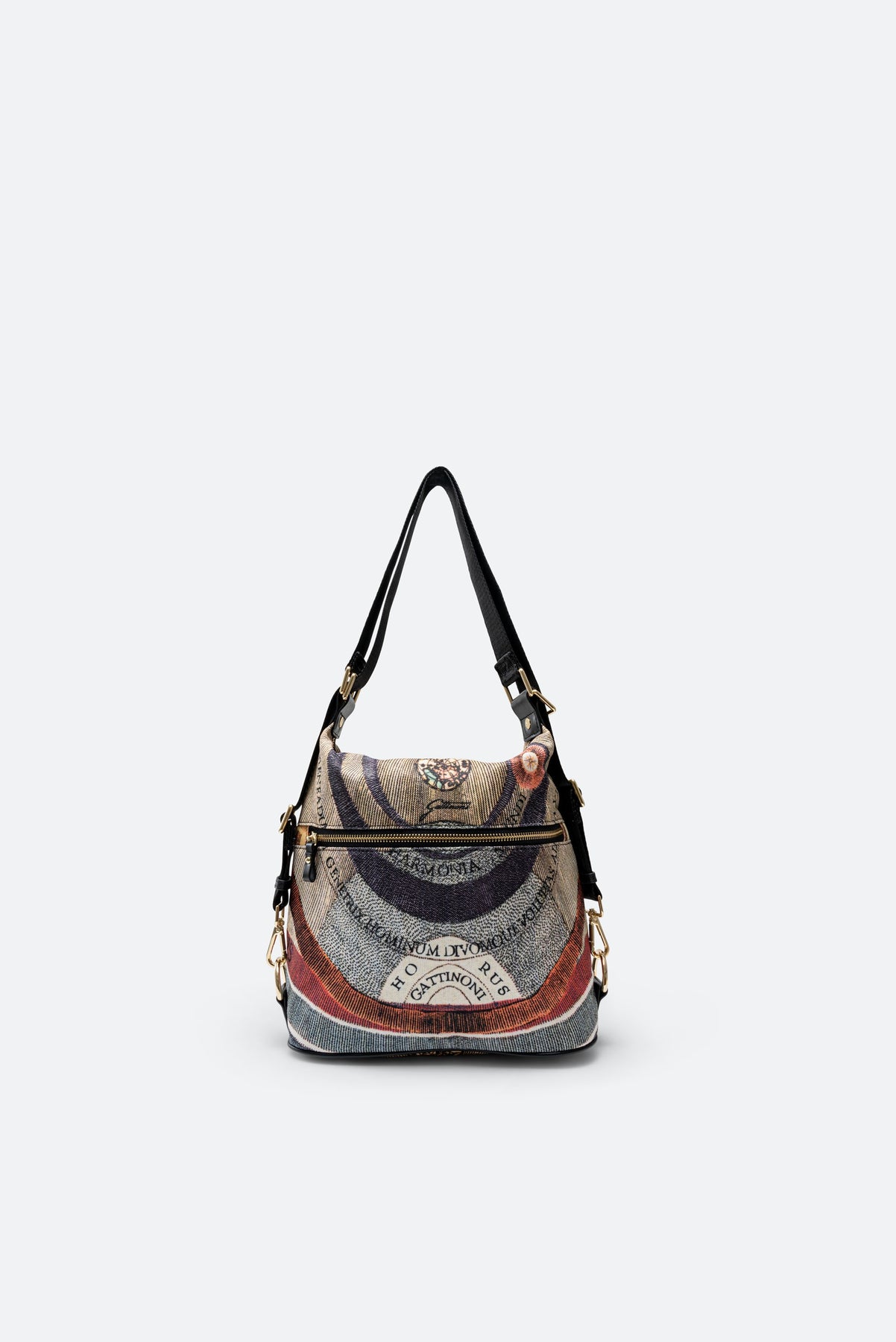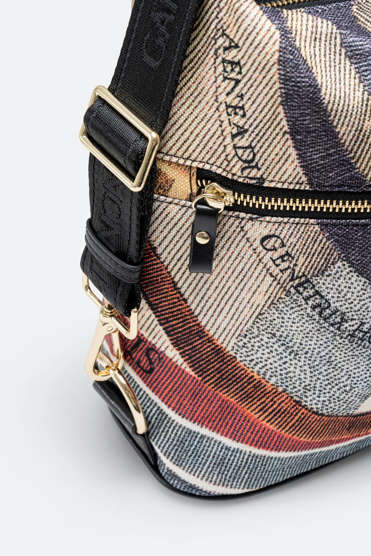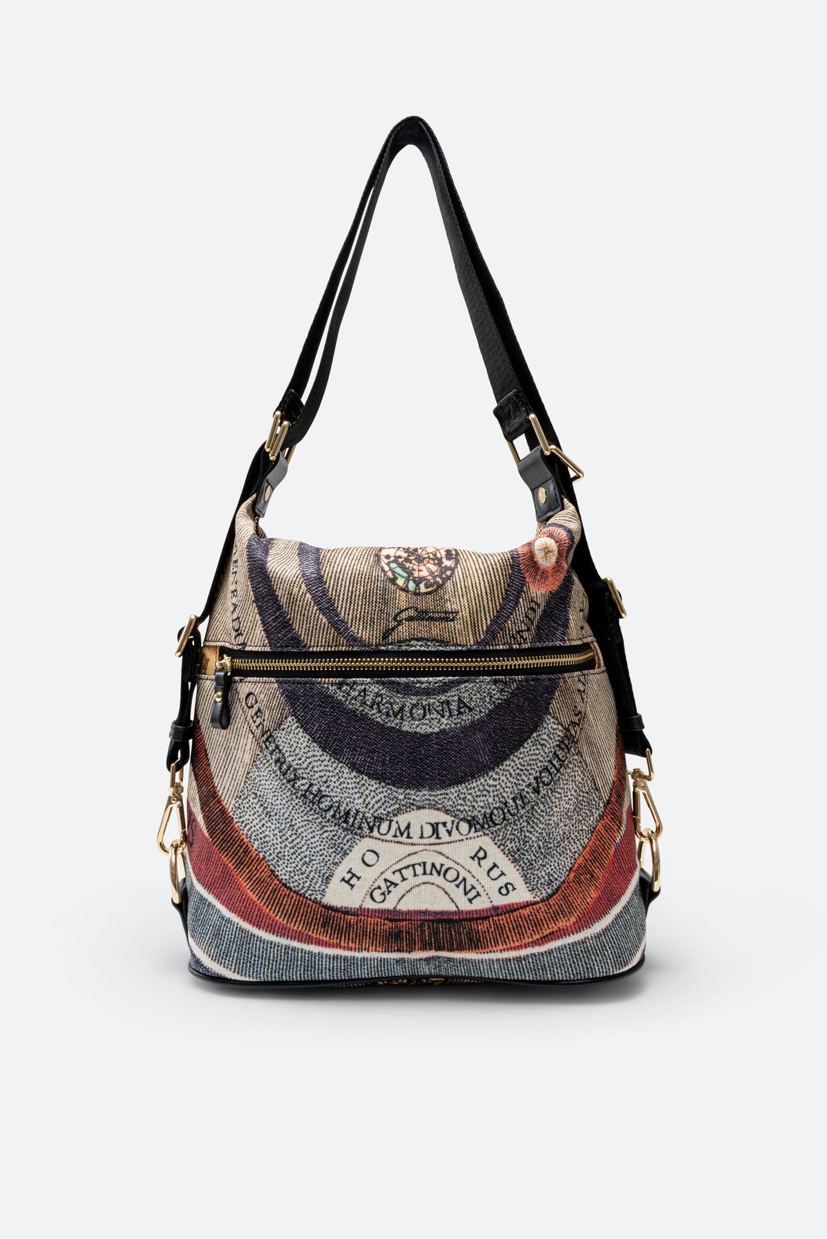 Borsa utilizzabile a tracolla, o come zaino, sempre con la stessa tracolla in dotazione. Basta agganciarne i moschettoni incrociando la tracolla e lo zaino è pronto.