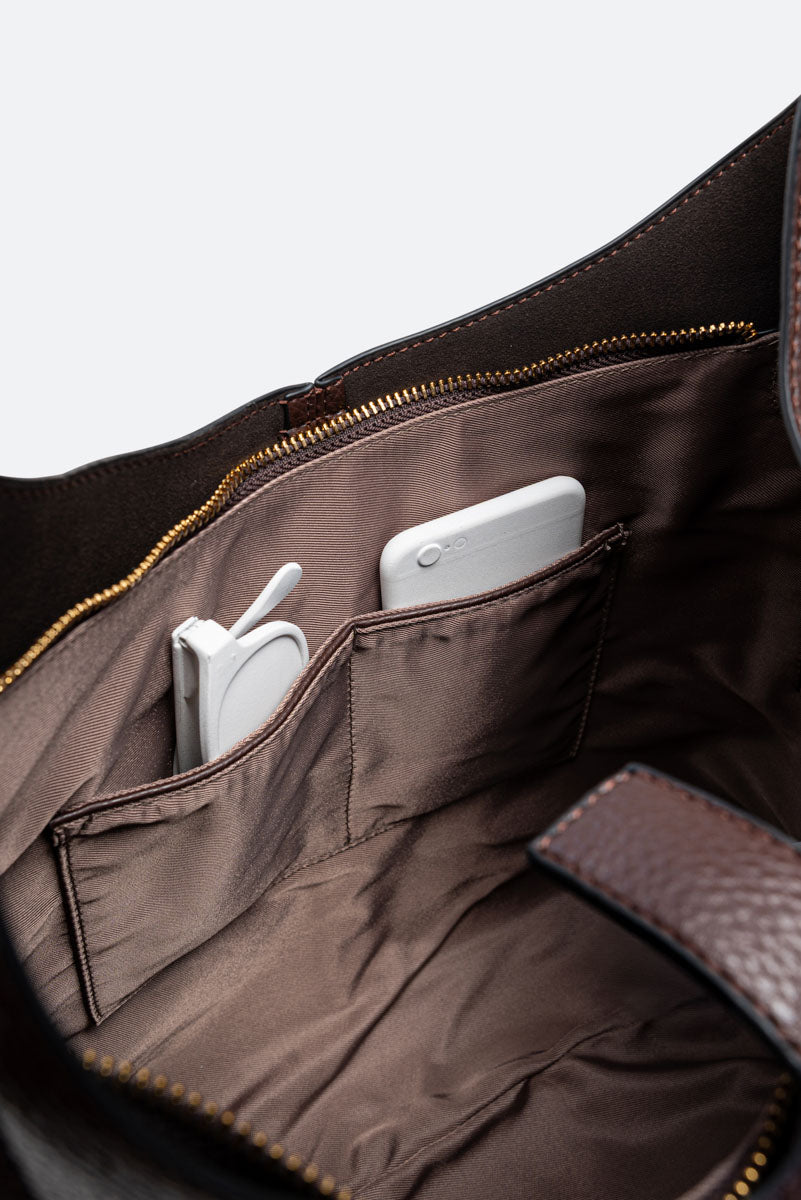 Borsa hobo capiente in pelle effetto martellato con logo metallico frontale e manico singolo. Design morbido e sofisticato per un’eleganza quotidiana.