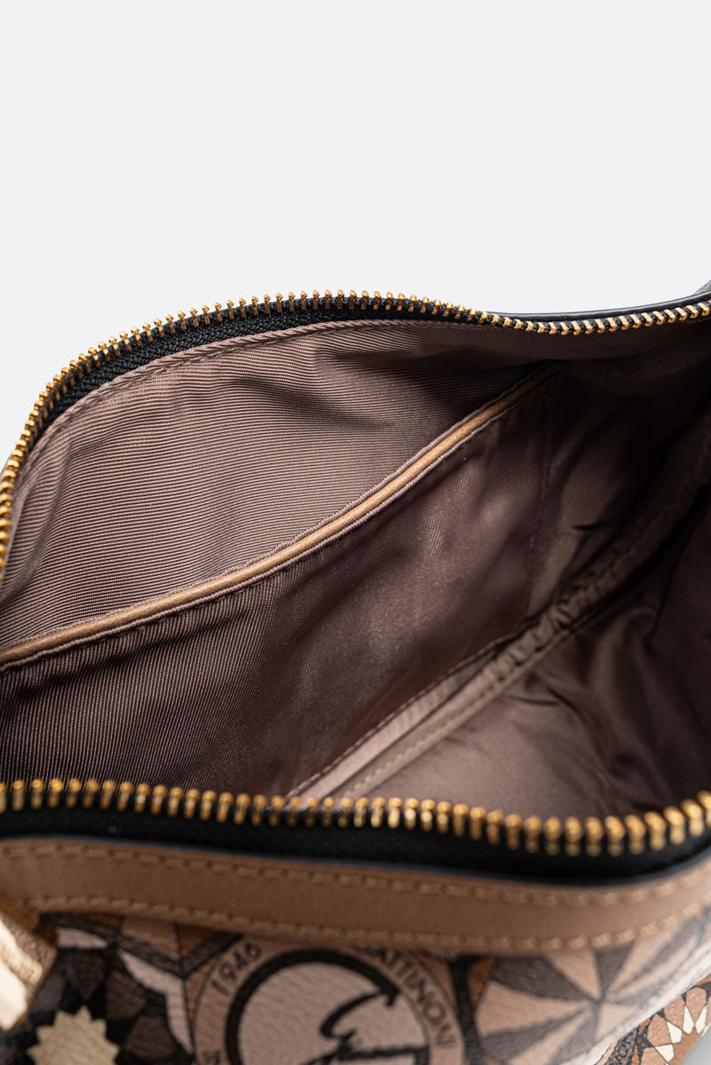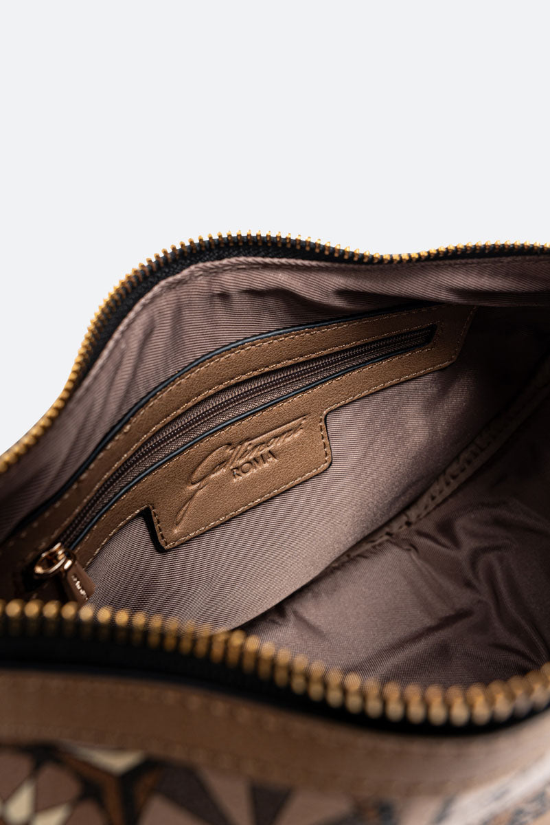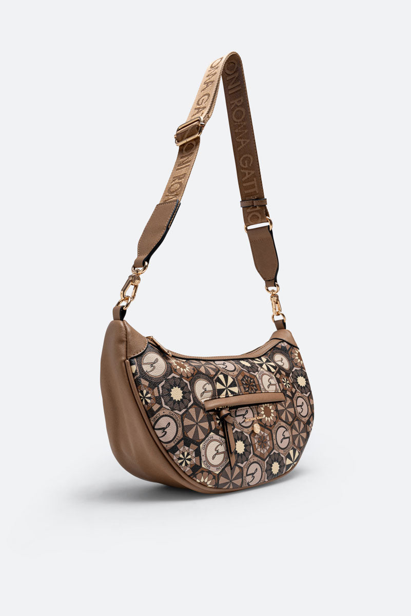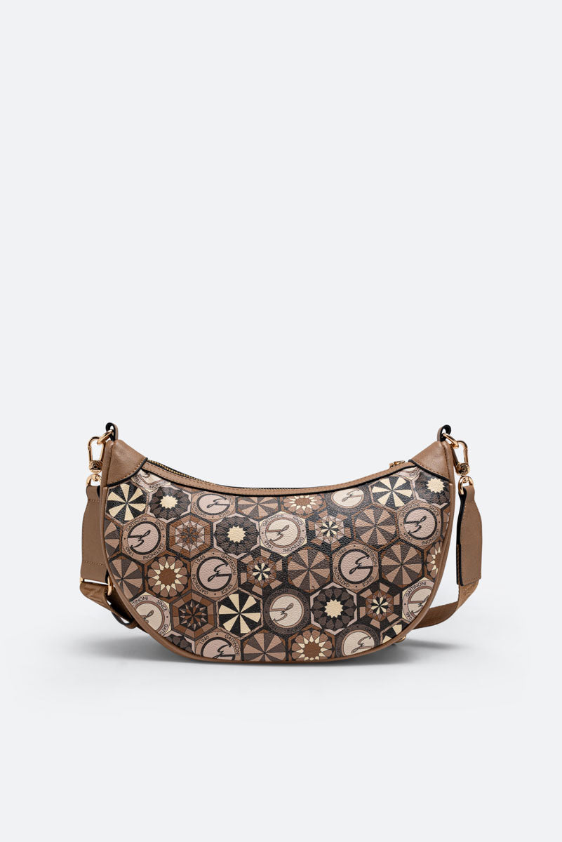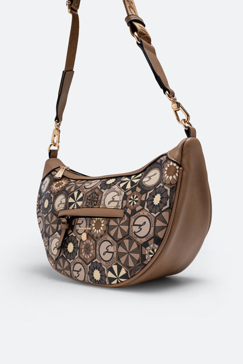 Borsa "Hobo" dalla classica forma a mezzaluna con dettagli in pelle sintetica e tessuto principale in tela spalmata e stampata Teodosia Desert.