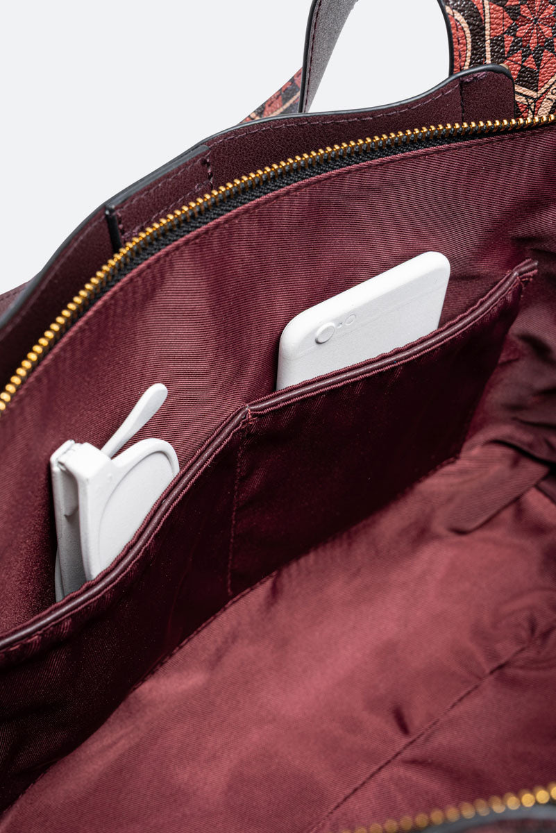 Borsa a spalla in tela spalmata e stampata Teodosia Garnet con fianchi in pelle sintetica color vinaccia. Tre scomparti capienti all'interno, di cui uno chiuso con zip.