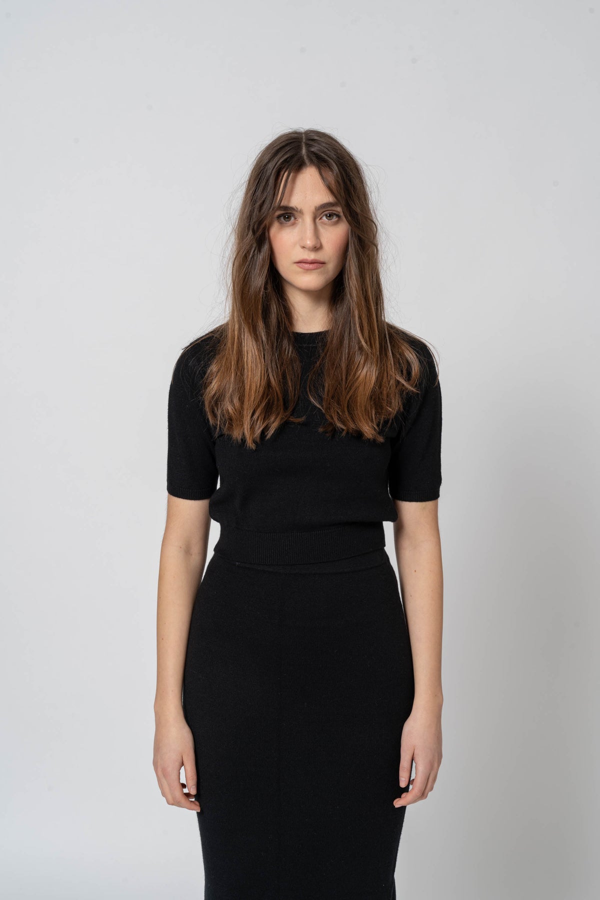 Gonna lunga in maglia rasata con spacchi laterali ed elastico in vita con ricamo logo a filo. Materiale e Composizione: 51% Viscosa 39% Poliestere 10% Elastan